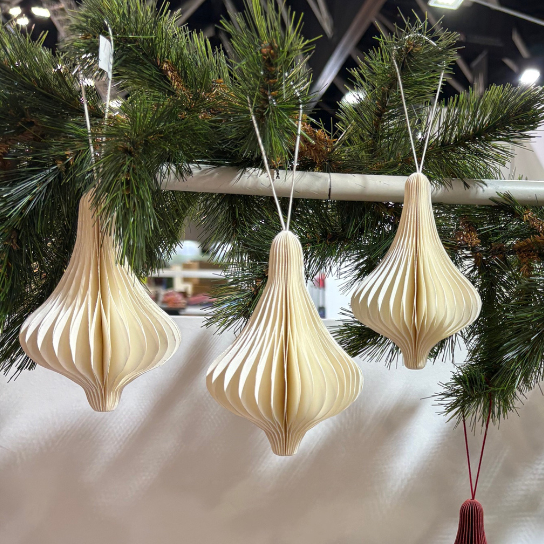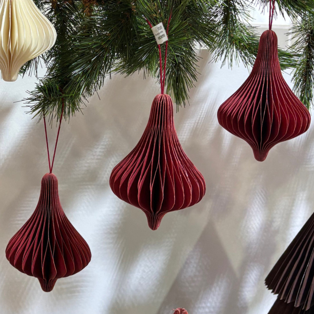This 3-piece box set of hanging ornaments adds a refined, decorative touch to any space. Each ornament comes fully constructed and is crafted from sustainable paper, featuring a beautiful drop-jewel shape with a soft, sculptural feel. Presented in a gorgeous, thoughtfully designed box, the set is perfect for gifting and ideal for storing and protecting the ornaments for years to come. Available in off-white and classic red, this timeless set blends beauty, sustainability, and practicality in one.